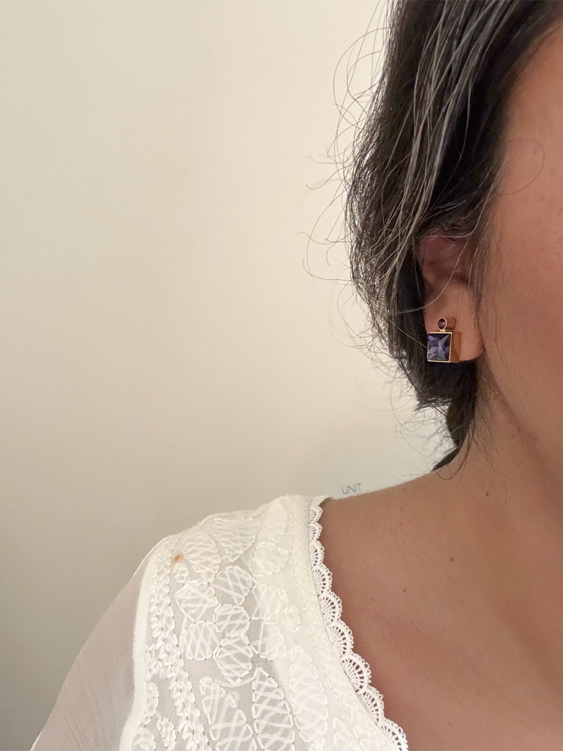 Bold yet refined, the Royale Amethyst Drops feature a striking purple square-cut crystal set beneath a rich purple-toned stud. Their clean gold frame adds a modern touch to their regal charm.