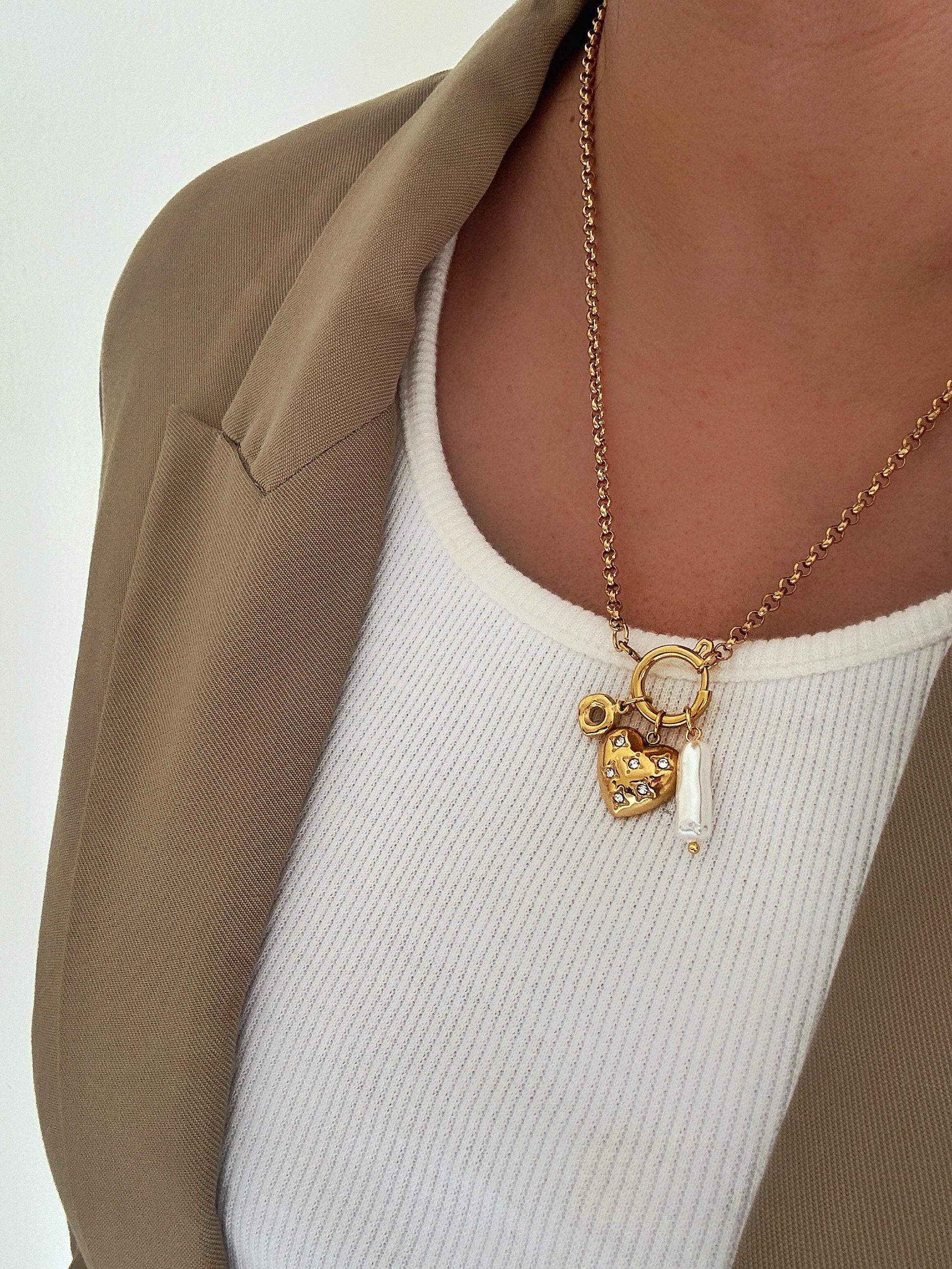A playful gold necklace with three charms — a pearl drop, a star-studded heart, and a circular link centerpiece — creating a modern yet romantic look.