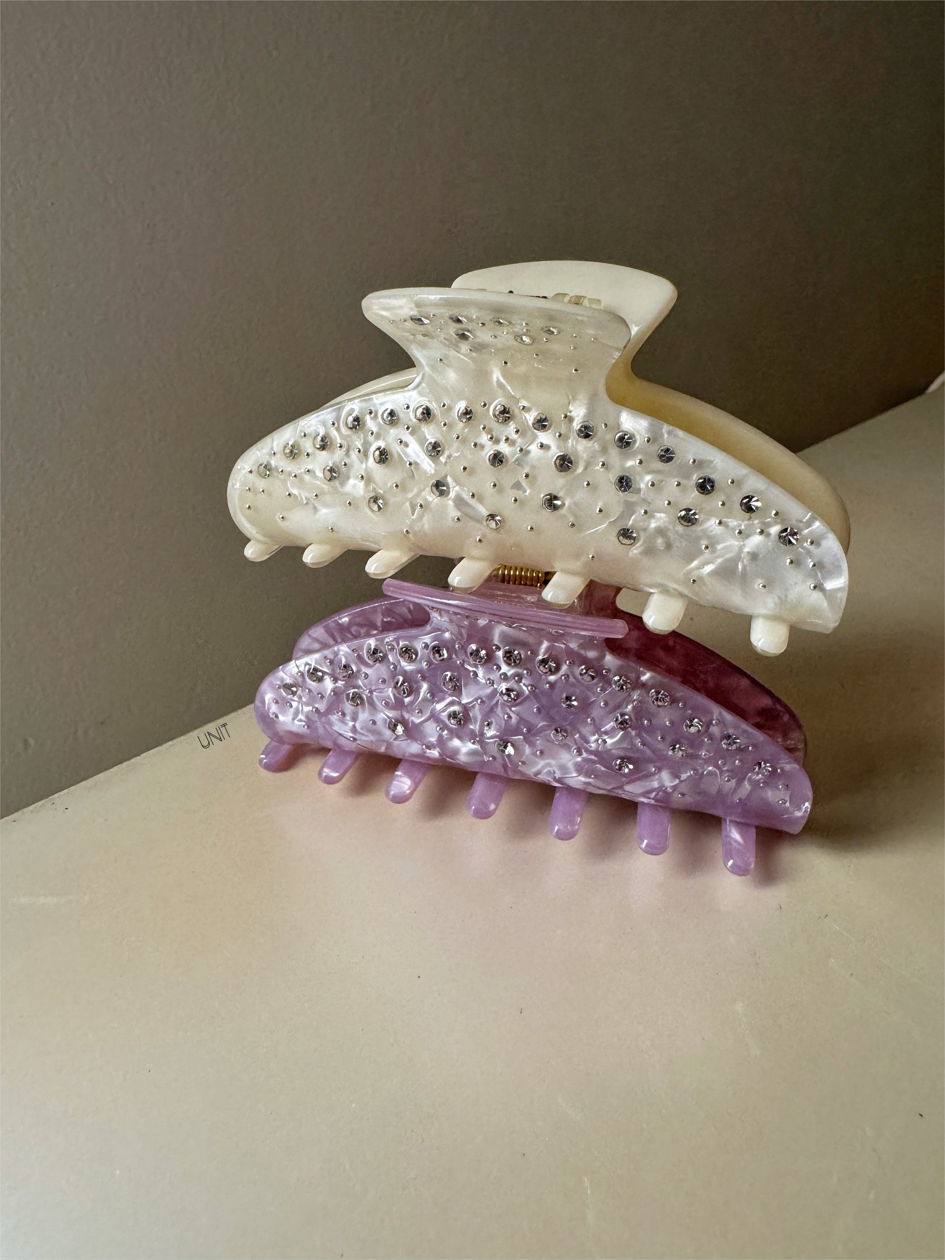 Delicate lavender meets sparkling crystal accents in this playful yet elegant hair clip. A perfect pastel accessory to brighten up your collection.