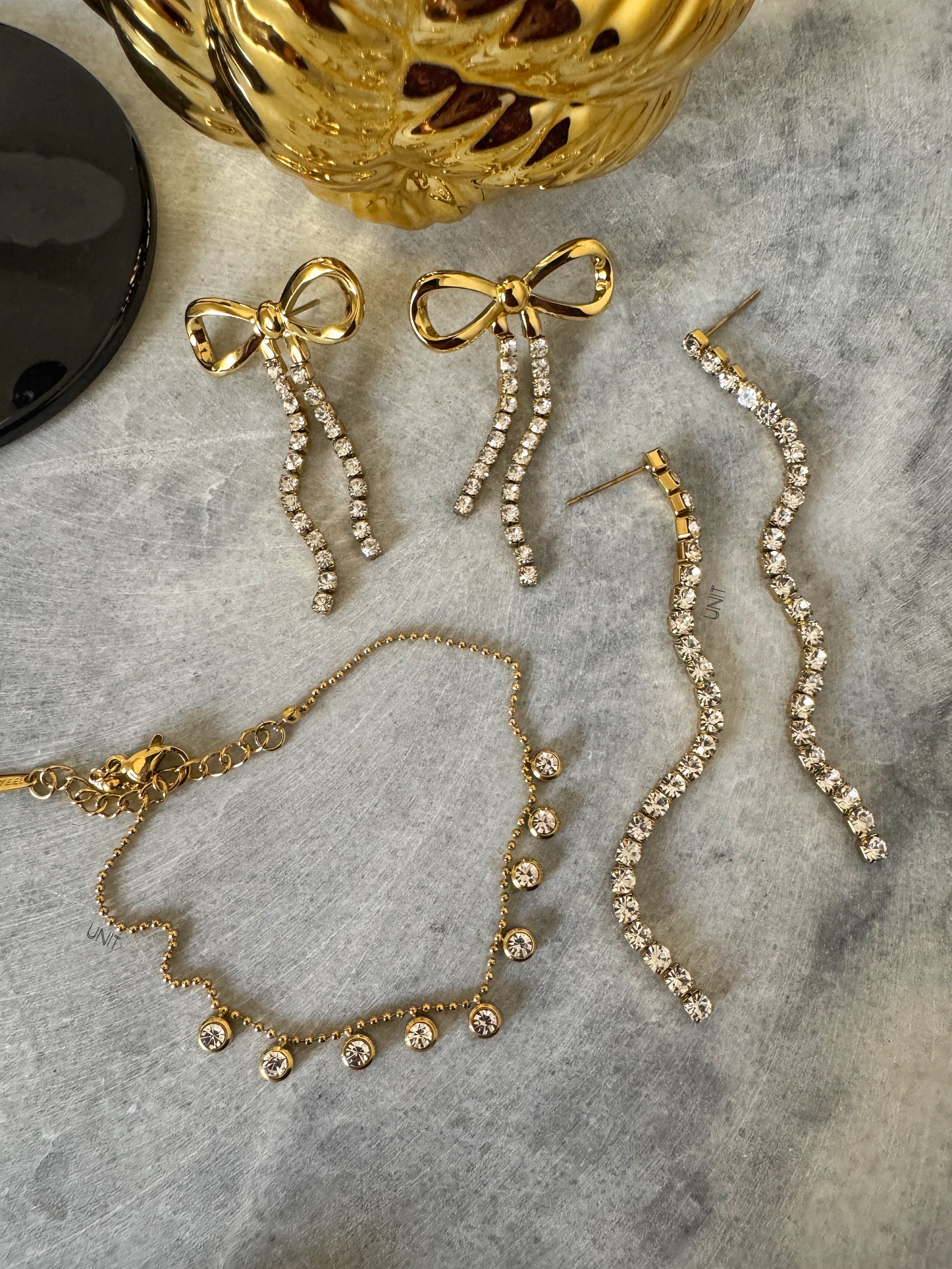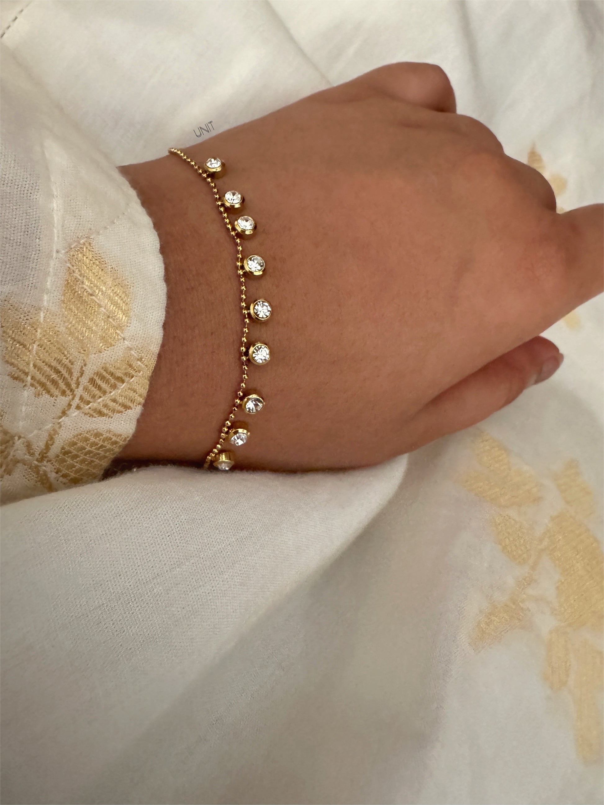 Delicate and luminous, the Mira Bracelet features tiny gold beads and a row of shimmering crystal charms. Light-catching and feminine — perfect worn alone or stacked.
