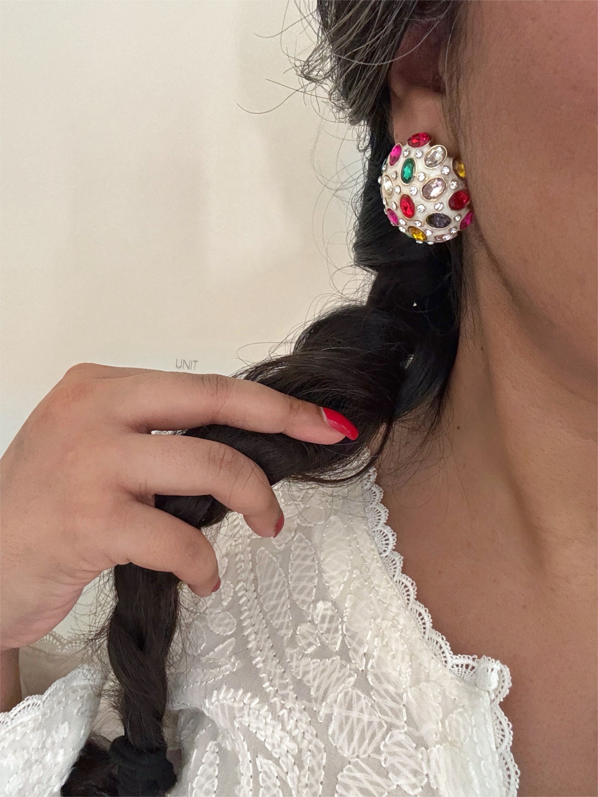 A playful burst of color, the Celeste Jewel Domes are pearl-like studs encrusted with vibrant multicolor crystals. Joyful and unique, they bring an instant spark to any outfit.