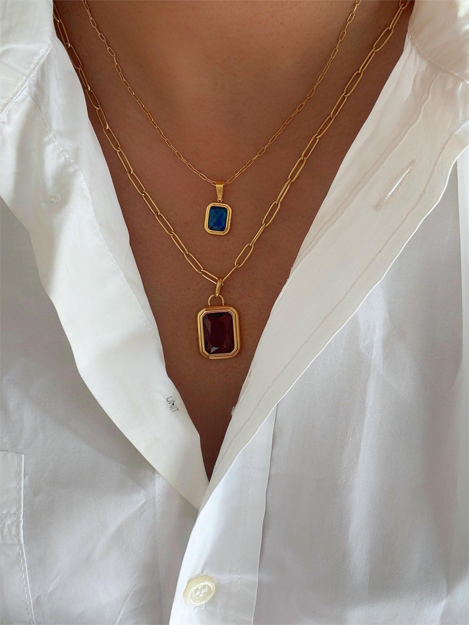 A bold rectangular sapphire-blue stone framed in gold, designed to stand out on its own or layered with other chains.