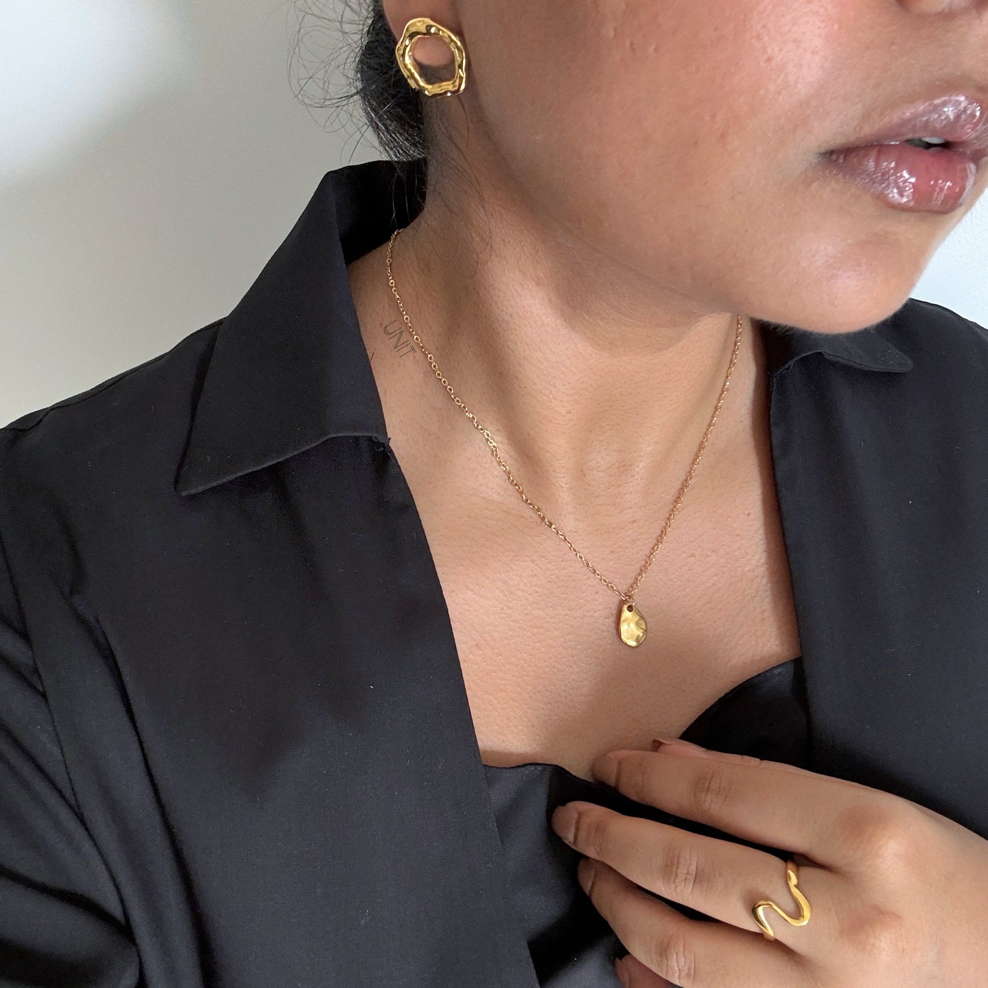Modern and fluid, the Sena Earrings showcase an open organic hoop shape with a soft, molten texture. Minimal yet striking — perfect for day-to-night styling.