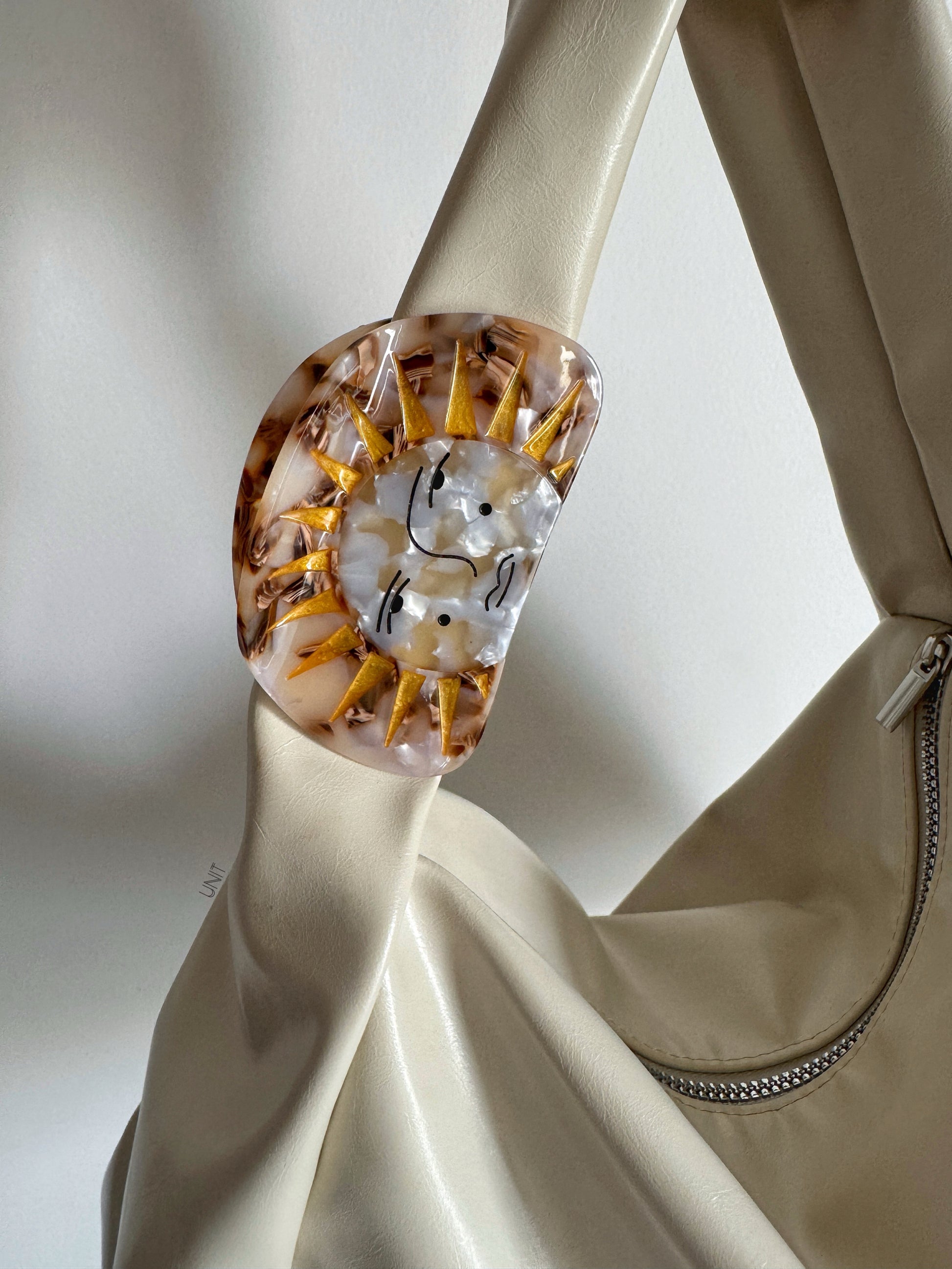 A statement hair clip featuring a whimsical sun face framed with golden rays. Its marbled acetate background and bold design make it a standout piece, perfect for adding character to your hairstyle.